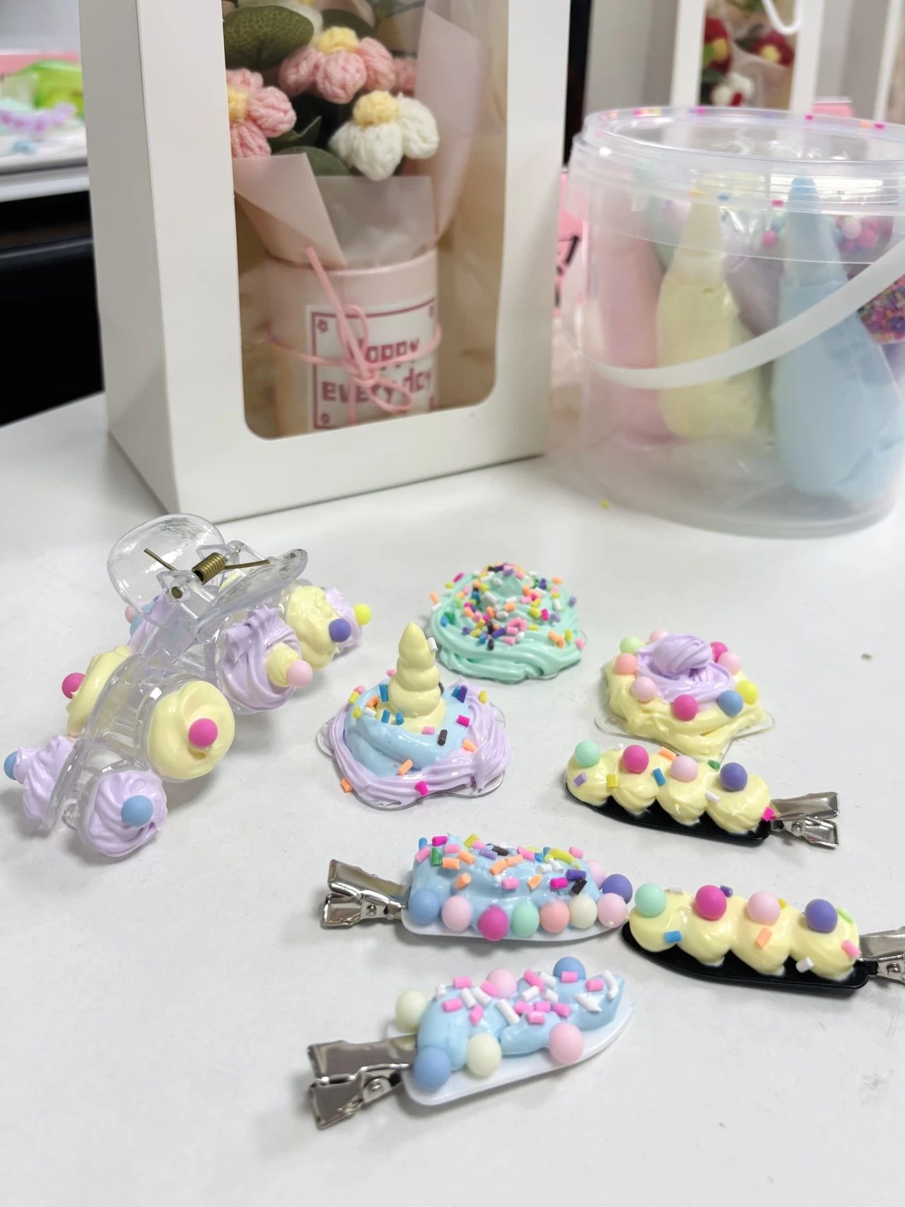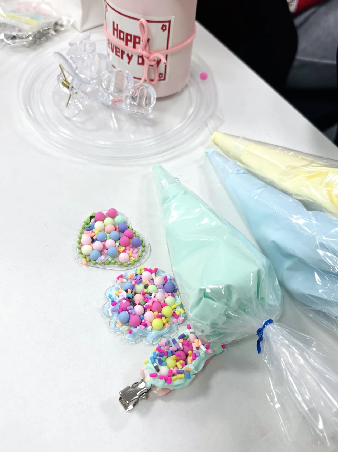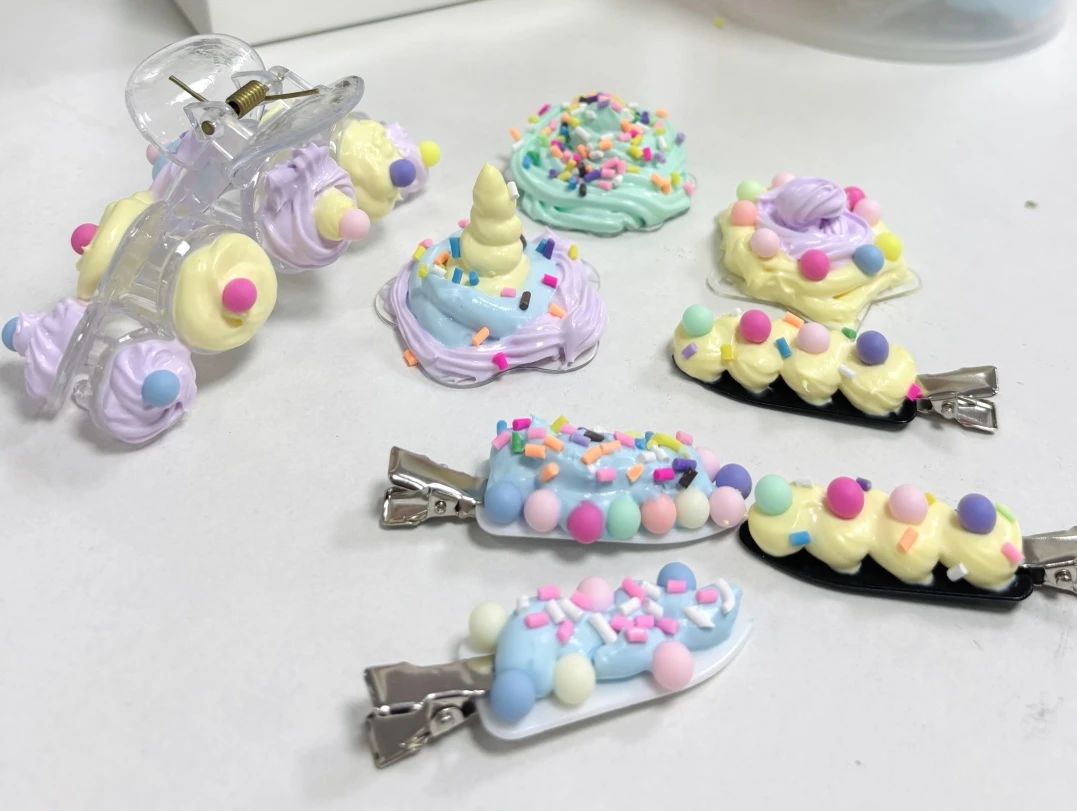 活動現(xiàn)場化身為夢幻手作樂園:挺進(jìn)總部會議室內(nèi)的長桌上,堆滿糖果色奶油膠與裝飾等元素。大家從擠膠、塑形到點(diǎn)綴裝飾,全情投入創(chuàng)作——有人將發(fā)夾捏成甜甜圈的甜蜜形狀,也有人用星空元素打造銀河系耳畔的浪漫。挺進(jìn)的參與女性員工笑稱這場活動是"成年人的過家家"。